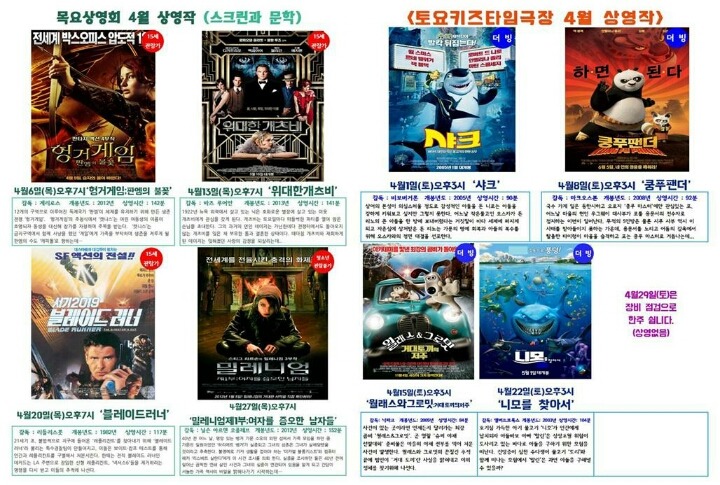 목요상영회는 매주 목요일 오후7시,토요키즈타임극장은 매주 토요일 오후3시에 있습니다.