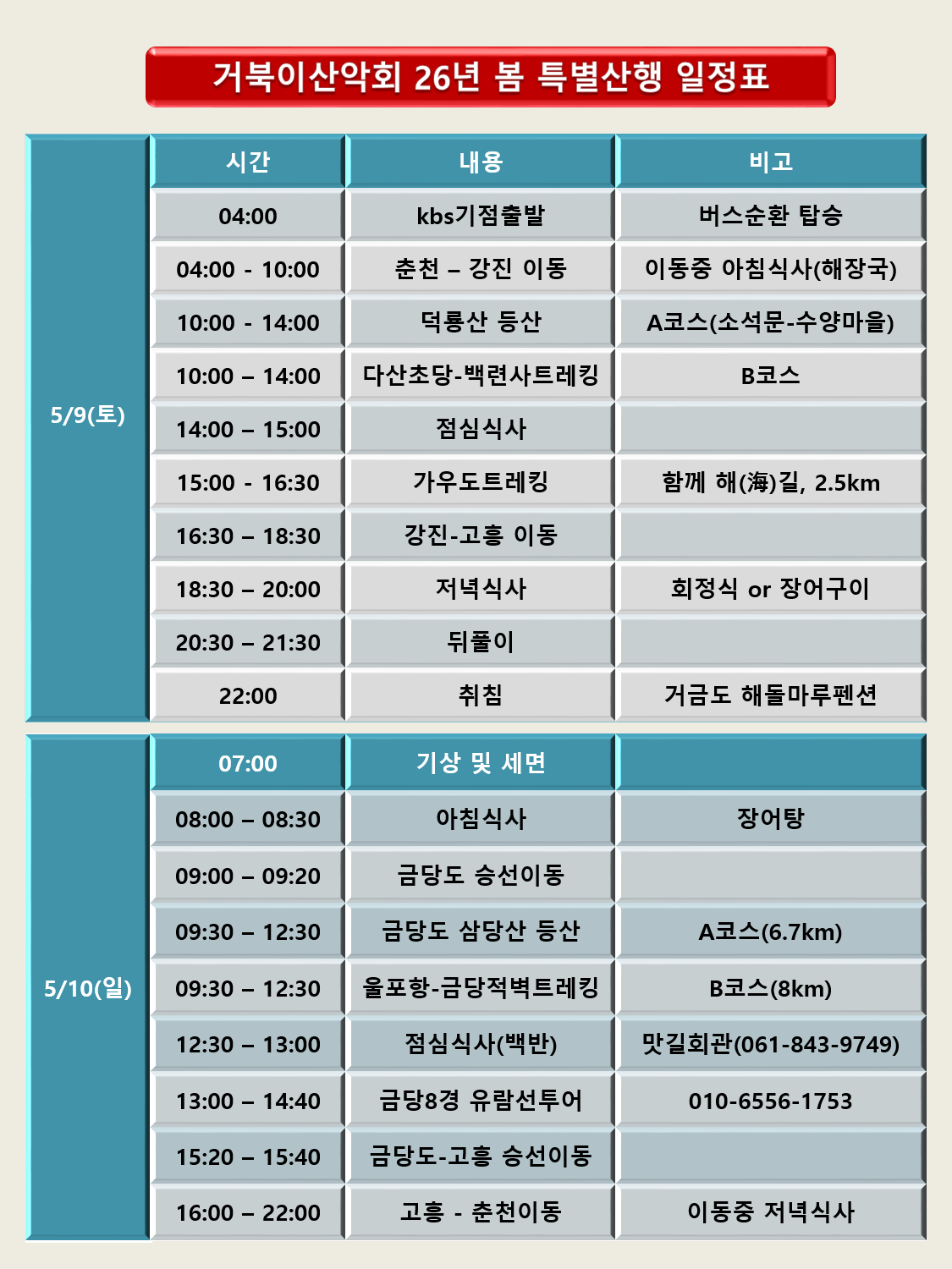 2. 자세한 산행 및 트레킹 코스와 이동 동선은 별도 공지할 예정입니다.