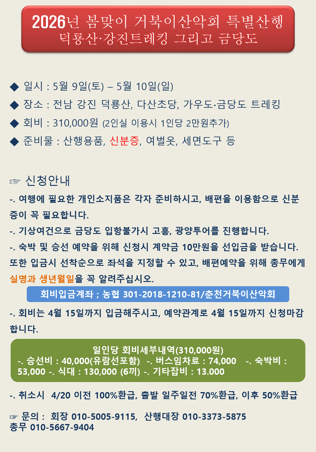 5. 여러분의 많은 성원 부탁드리며, 문의사항은 위 공지문의 회장, 대장, 총무님께 문의하여 주시면 감사하겠습니다.
