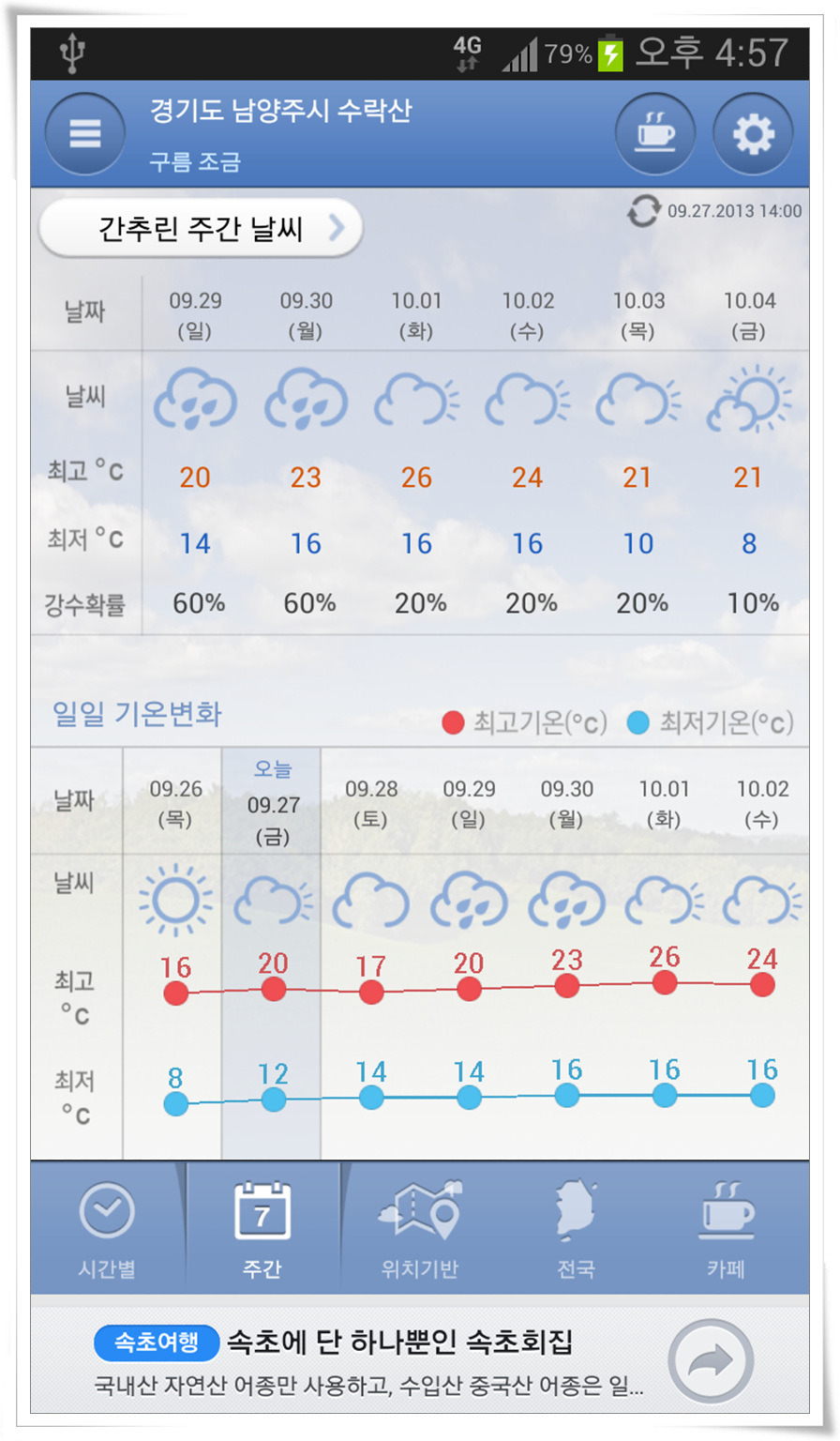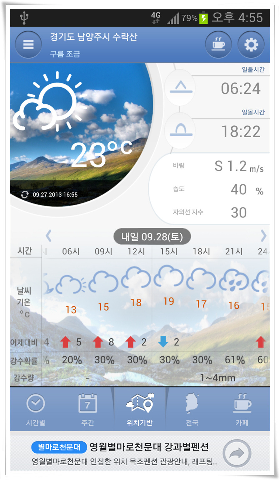 [산행할 곳 날씨]9월 28일(토) 산행할, 수락산 주변인, 경기 남양주시 별내면 날씨 예보 작성자86이상문|작성시간13.09.27|조회수323 목록 댓글 2 글자크기 작게가 글자크기 크게가 다음검색 현재 게시글 추가 기능 열기 북마크 공유하기 신고 센터로 신고 댓글 댓글 2 댓글쓰기 답글쓰기 댓글 리스트 작성자86이상문 작성자 본인 여부 작성자 | 작성시간 13.09.27 내일은 산행하기에 좋은 가을날씨 같습니다. 내일 저녁무렵부터 일요일은 비가 하루 종일 내릴 것 같네요!다행히 거북이님들 가시는 길은 비가 내리지 않을 듯 합니다. 그래도 모르니, 항상 배낭에 긴팔옷과 우비도 챙겨 넣어 두세요^^ 작성자안나 푸루나(김보회) | 작성시간 13.09.27 좋은 정보 감사합니다... 댓글 전체보기