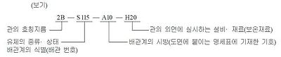 이송유체의 종류· 상태 및 배관계의 종류 등의 표시방법은 아래 보기와 같이 표시하며, 표시 항목은 원칙적으로 다음 순서에 따라 필요한 것을 글자· 글자기호를 사용하여 표시한다. 또한, 추가할 필요가 있는 표시항목은 그 뒤에 붙이며, 글자기호의 뜻은 도면상의 보기 쉬운 위치에 명기한다.
