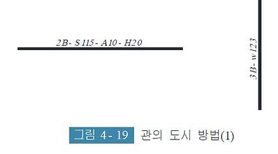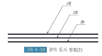 [그림 4- 19]와 같이 표시하는 관을 선의 위쪽에 선을 따라서 도면의 밑면 또는 우변으로부터 읽을 수 있도록 기입한다. 다만, 복잡한 도면 등에서 오해를 일으킬 우려가 있을때는 [그림 4- 20]과 같이 각각 인출선을 사용하여 기입한다.