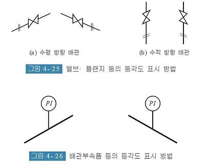 밸브· 플랜지· 배관부속품 등의 등각도 표시 방법은 [그림 4- 25, 4- 26]의 보기에 따른다.