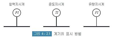 계기를 표시하는 경우에는 [그림 4- 23]과 같이 관을 표시하는 선에서 분기시킨 가는 선의 끝에 원을 그려서 계기의 측정하는 변동량 및 기능 등을 표시하는 글자기호를 표시한다.