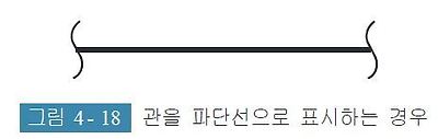 관은 원칙적으로 1줄의 실선으로 도시하고, 동일 도면 내에서는 같은 굵기의 선을 사용한다. 다만, 관의 계통, 상태, 목적을 표시하기 위하여 선의 종류(실선, 파선, 쇄선, 2줄의 평행선 등)를 바꾸어서 도시하여도 되며, 이 경우, 각각의 선의 종류의 뜻을 도면상의 보기 쉬운 위치에 명기한다. 또한, 관을 파단하여 표시하는 경우는 [그림 4- 18]과 같이 파단선으로 표시한다.