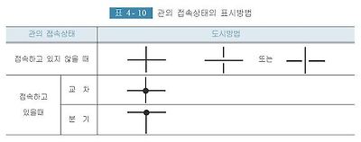 관을 표시하는 선이 교차하고 있는 경우에는 <표 4- 10>의 표시방법에 따라 각각의 관이 접속하고 있는지, 접속하고 있지 않은지를 표시한다.