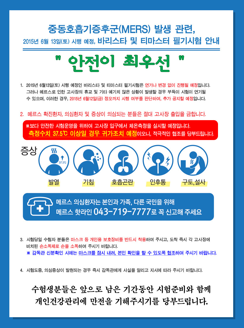 중동호흡기증후군(MERS) 발생 관련 바리스타 시험 안내 작성자커피문화원바리스타학원|작성시간15.06.10|조회수29 목록 댓글 0 글자크기 작게가 글자크기 크게가 중동호흡기증후군(MERS) 발생 관련 바리스타 시험 안내 http://barista.kcc-coffee.org/main/main.asp 다음검색 현재 게시글 추가 기능 열기 북마크 공유하기 신고 센터로 신고 댓글 댓글 0 댓글쓰기 답글쓰기 댓글 리스트