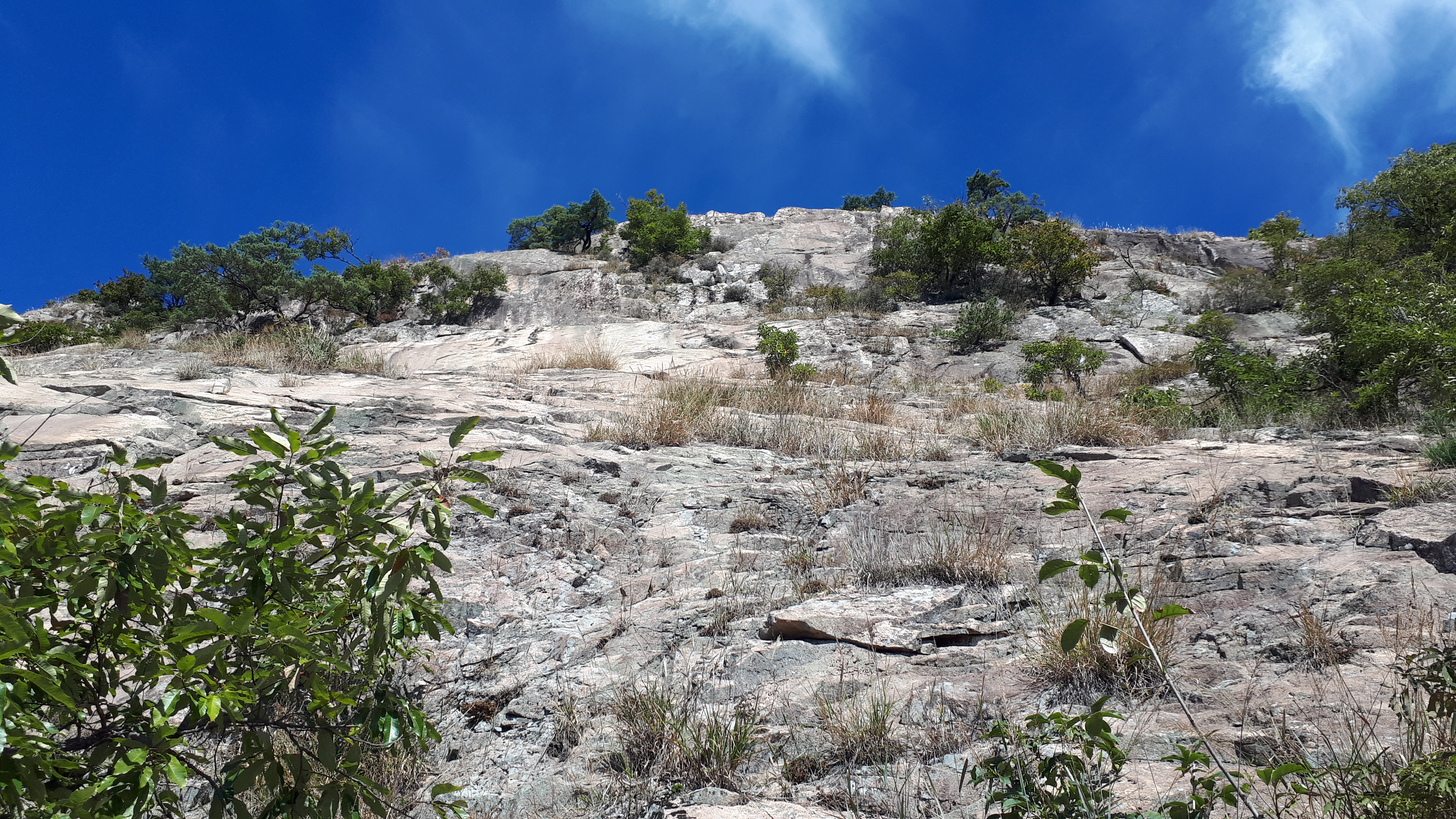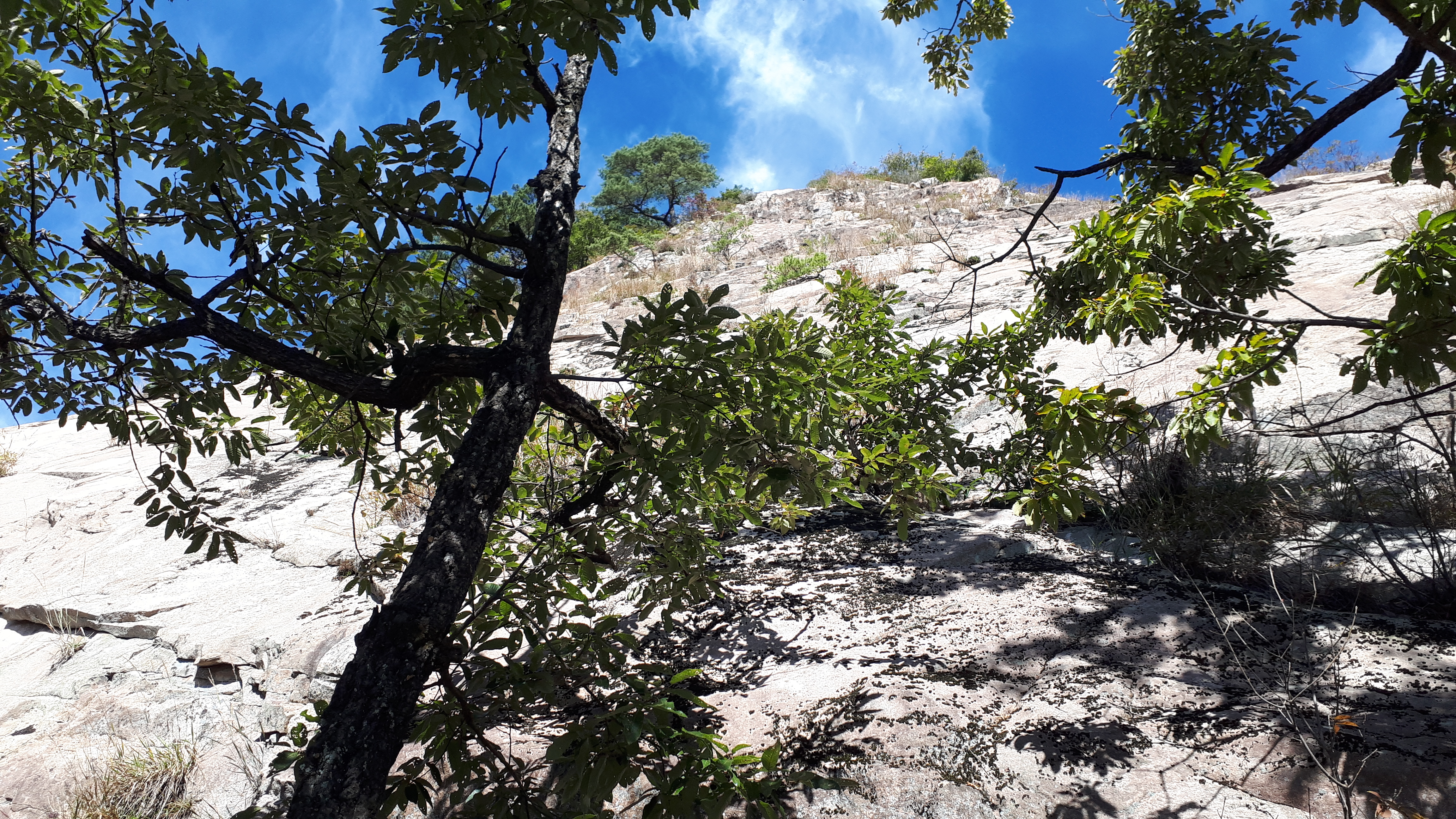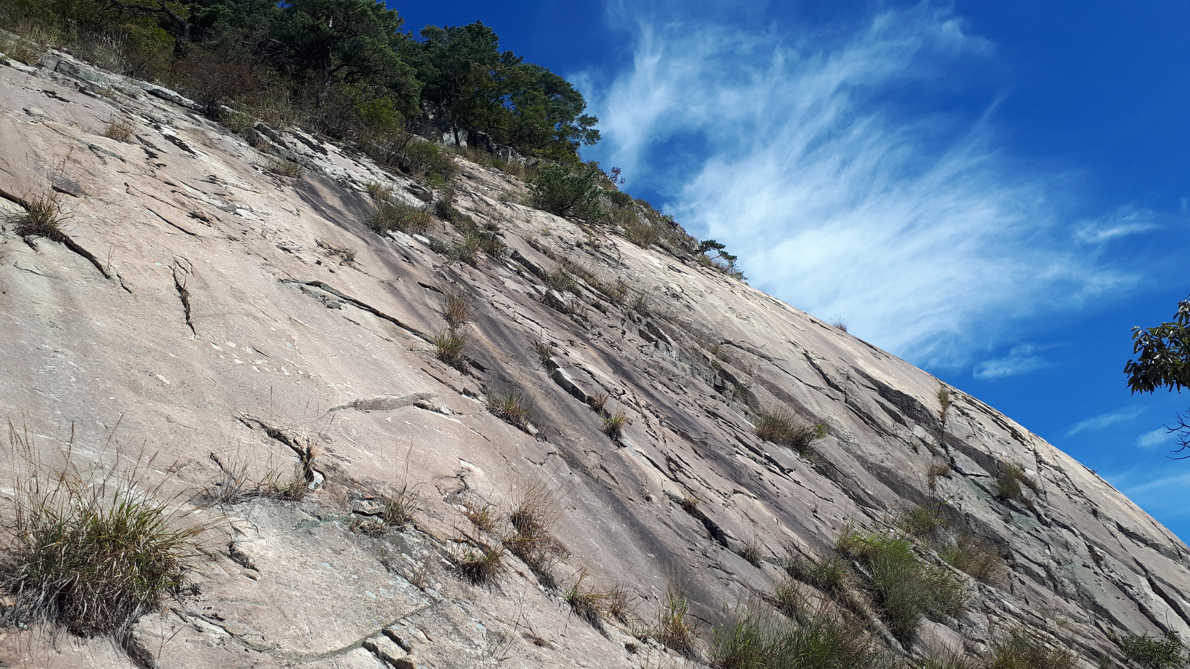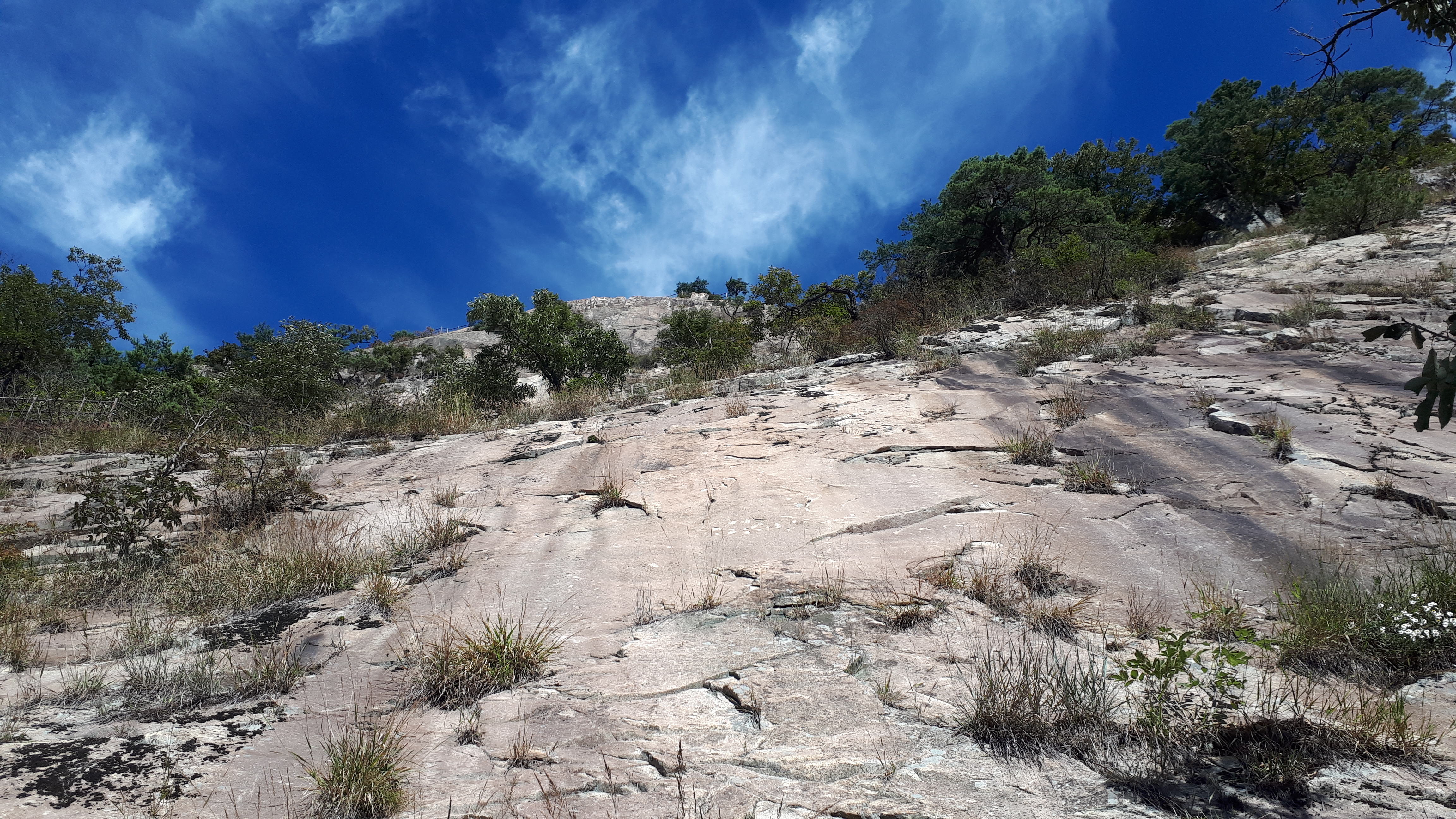 거대한 바위슬랩 위를 바라보면, 푸르른 하늘이 아름답습니다.