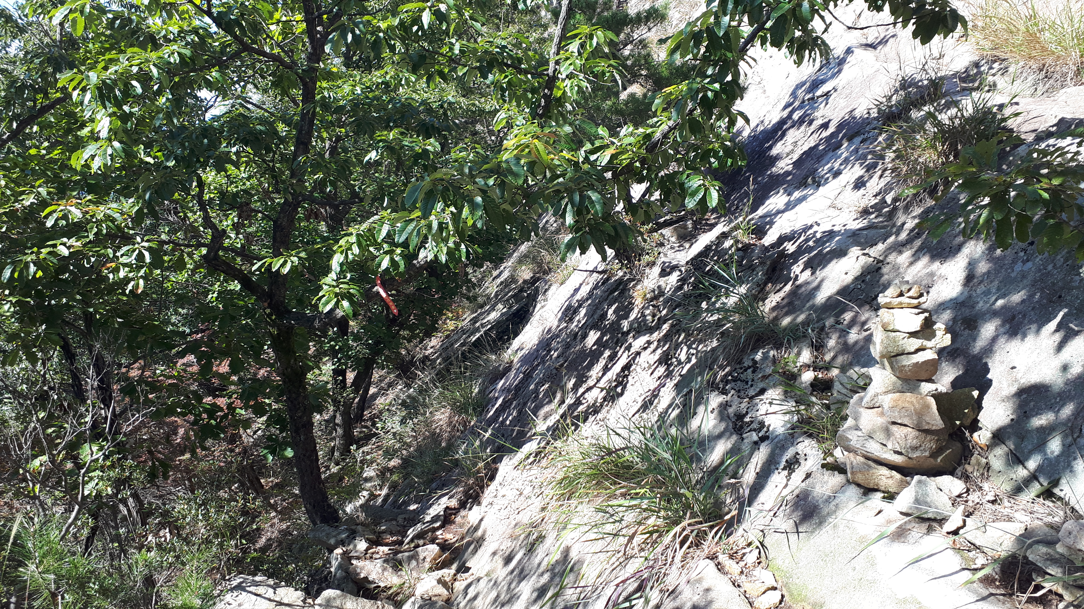 돌탑군을 지나면, 오른쪽 거대한 바위슬랩 가장자리를 따라 산길이 이어집니다.