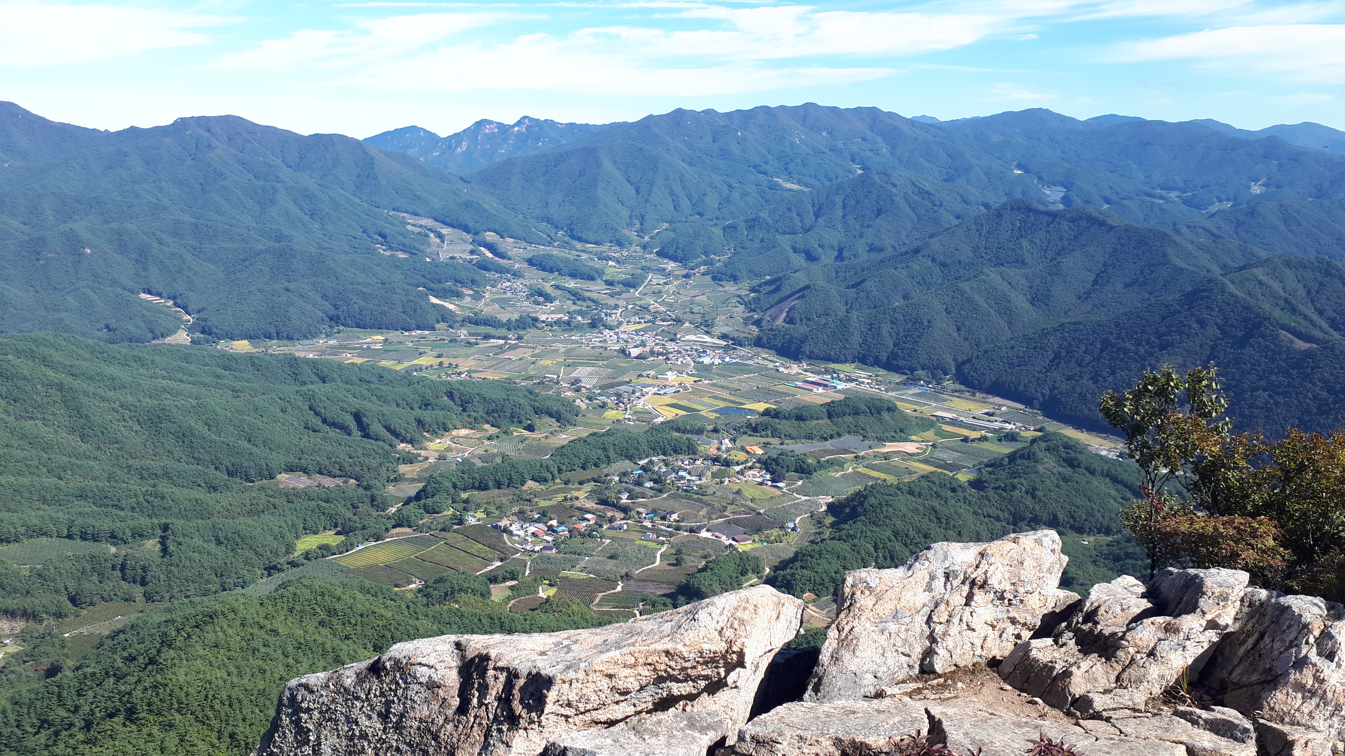 사방이 트인 암릉 오른쪽은 경북 문경시 동로면 적성리, 동로면 행정복지센터가 있는 면소재지 뒤로 충북 단양 도락산(965m)이 자리하고 있습니다.