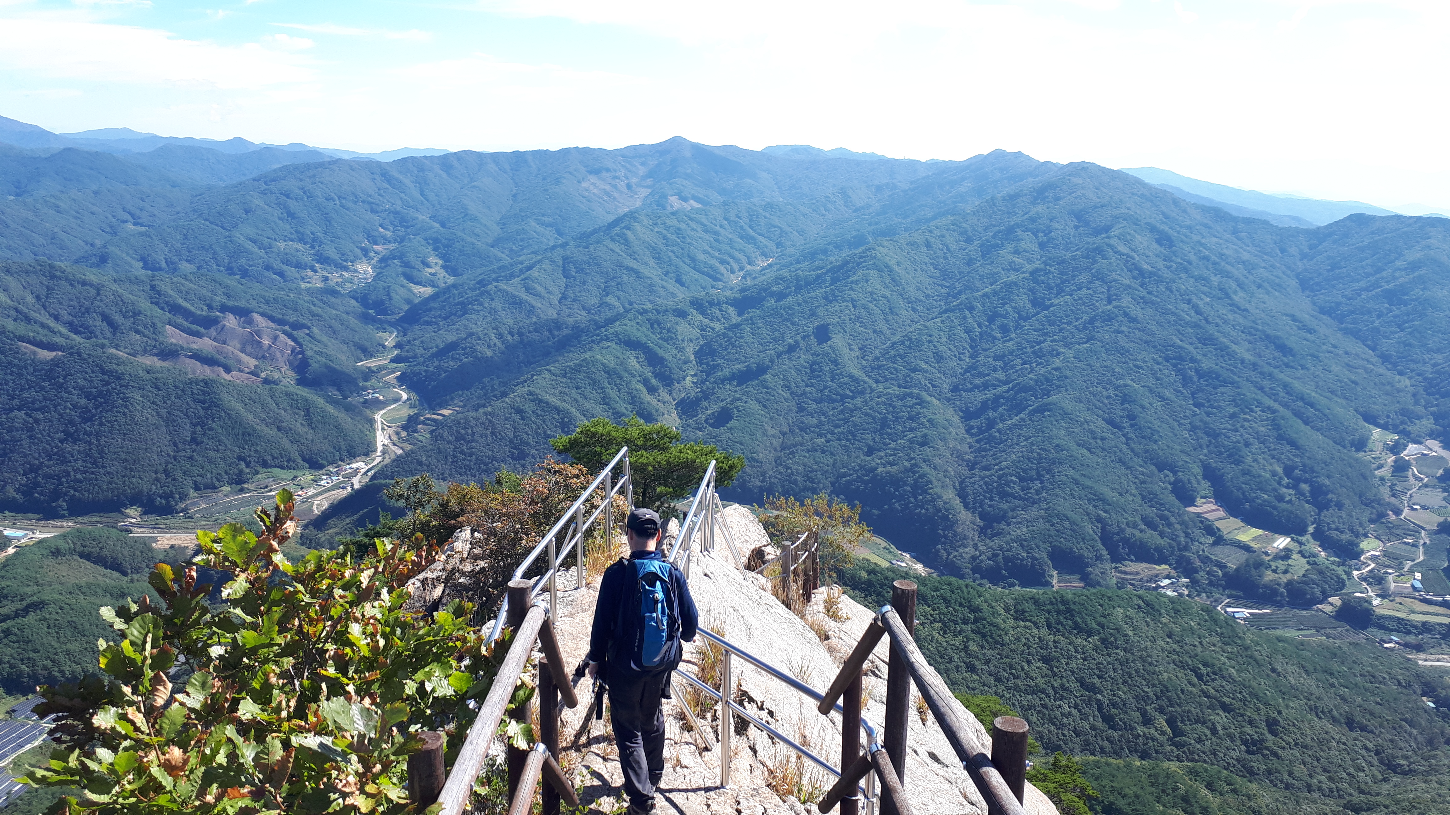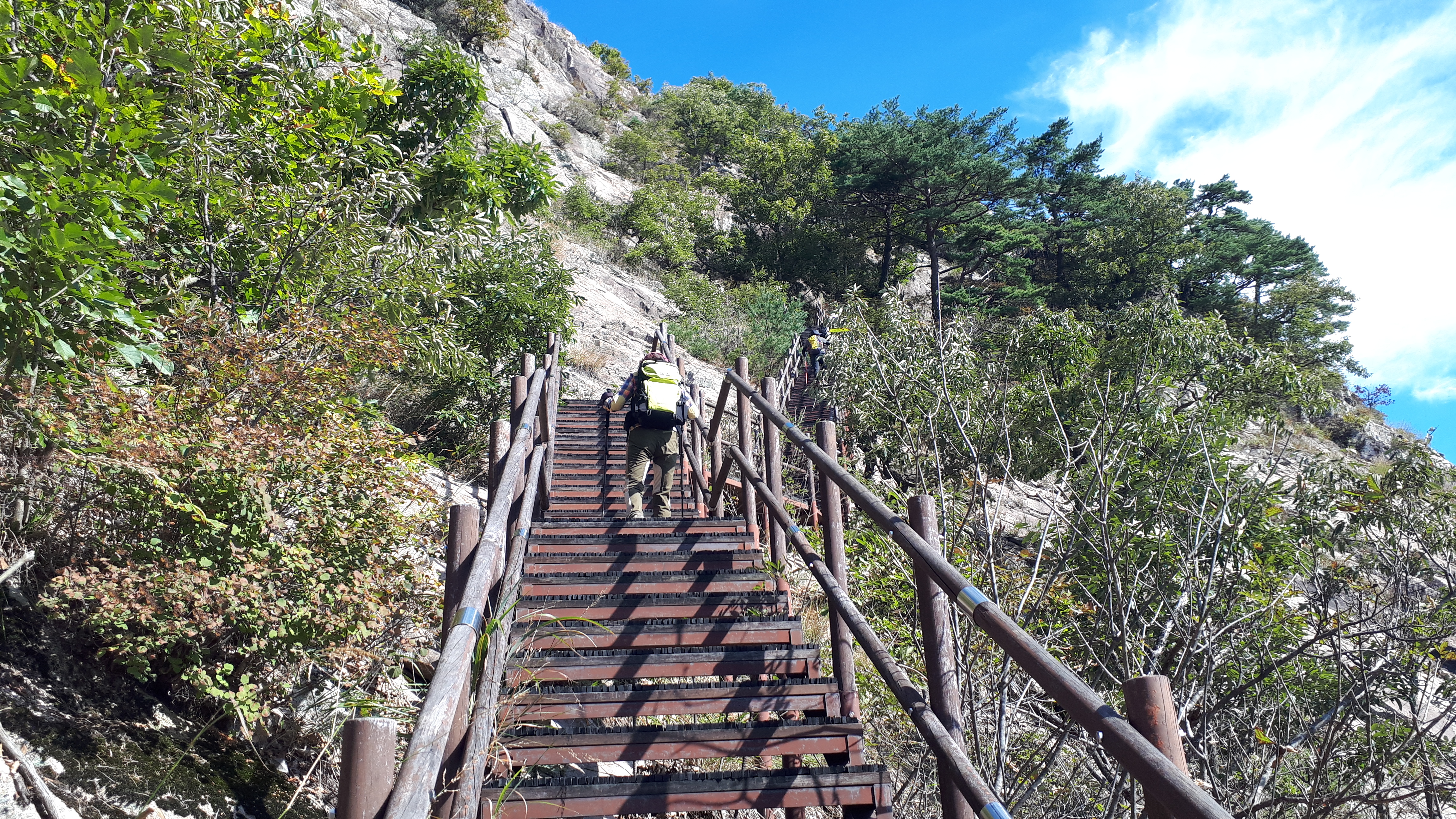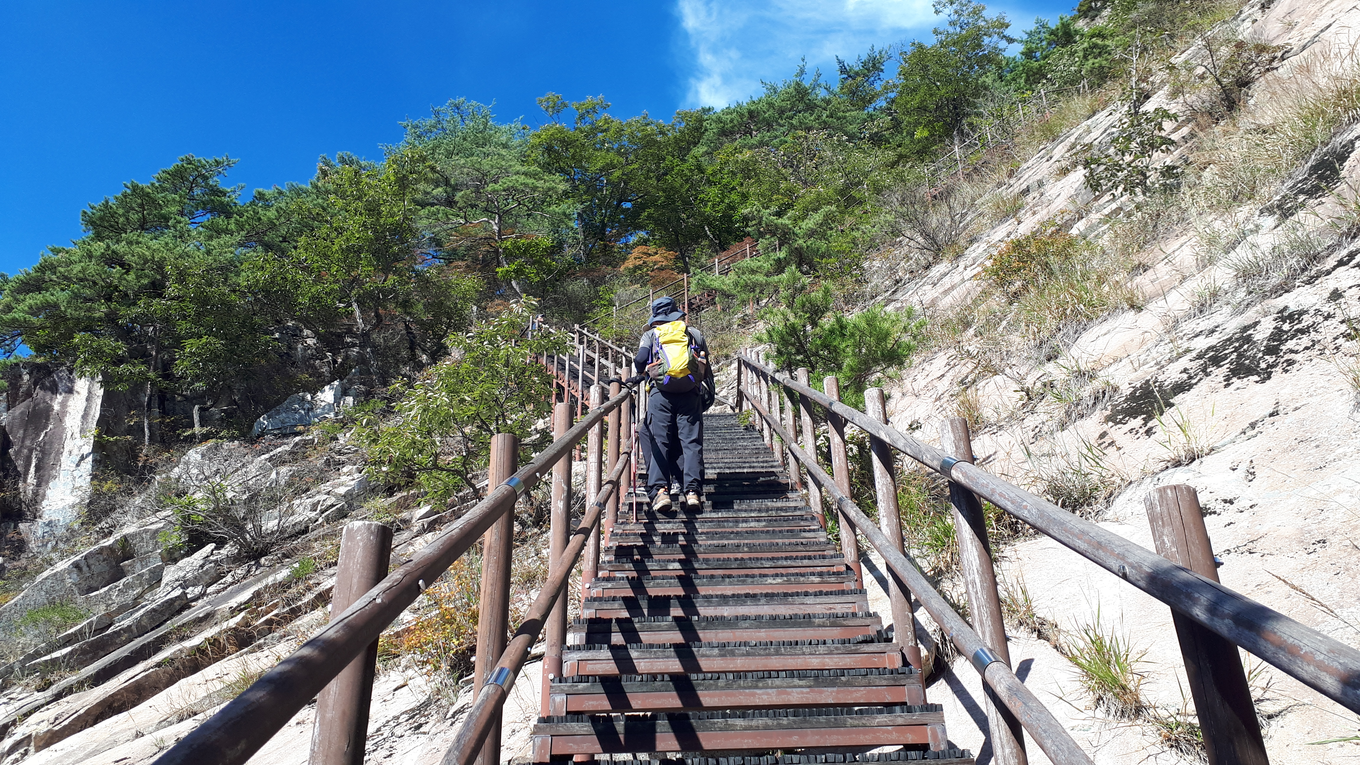 문경 천주산(836m)의 하이라이트는 거대한 암벽을 따라 지그재그로 올라가는 데크계단 길입니다.