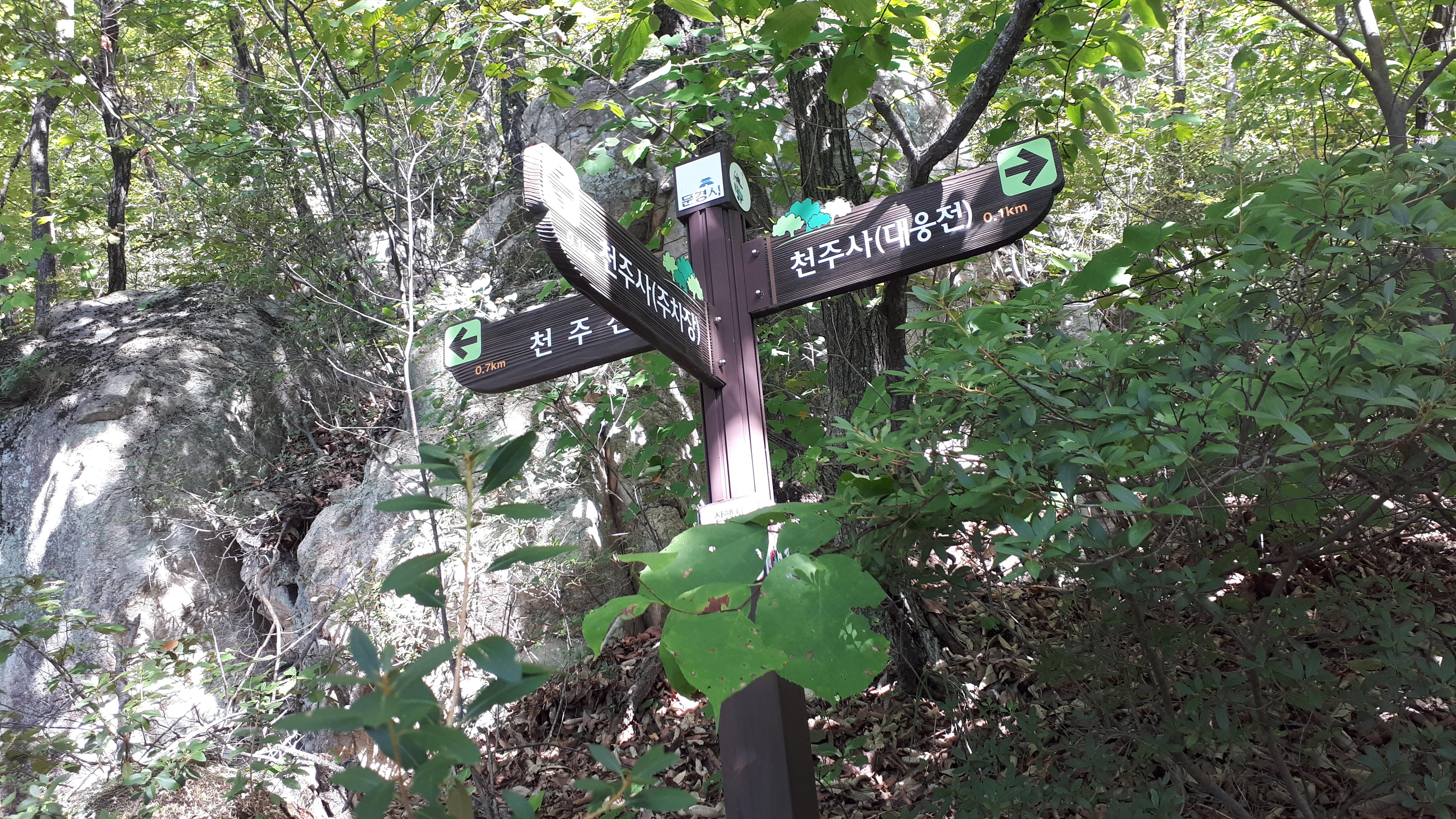주차장 갈림길 : 천주사(주차장)0.1km - 천주사(대웅전)0.1km - 천주산0.7km