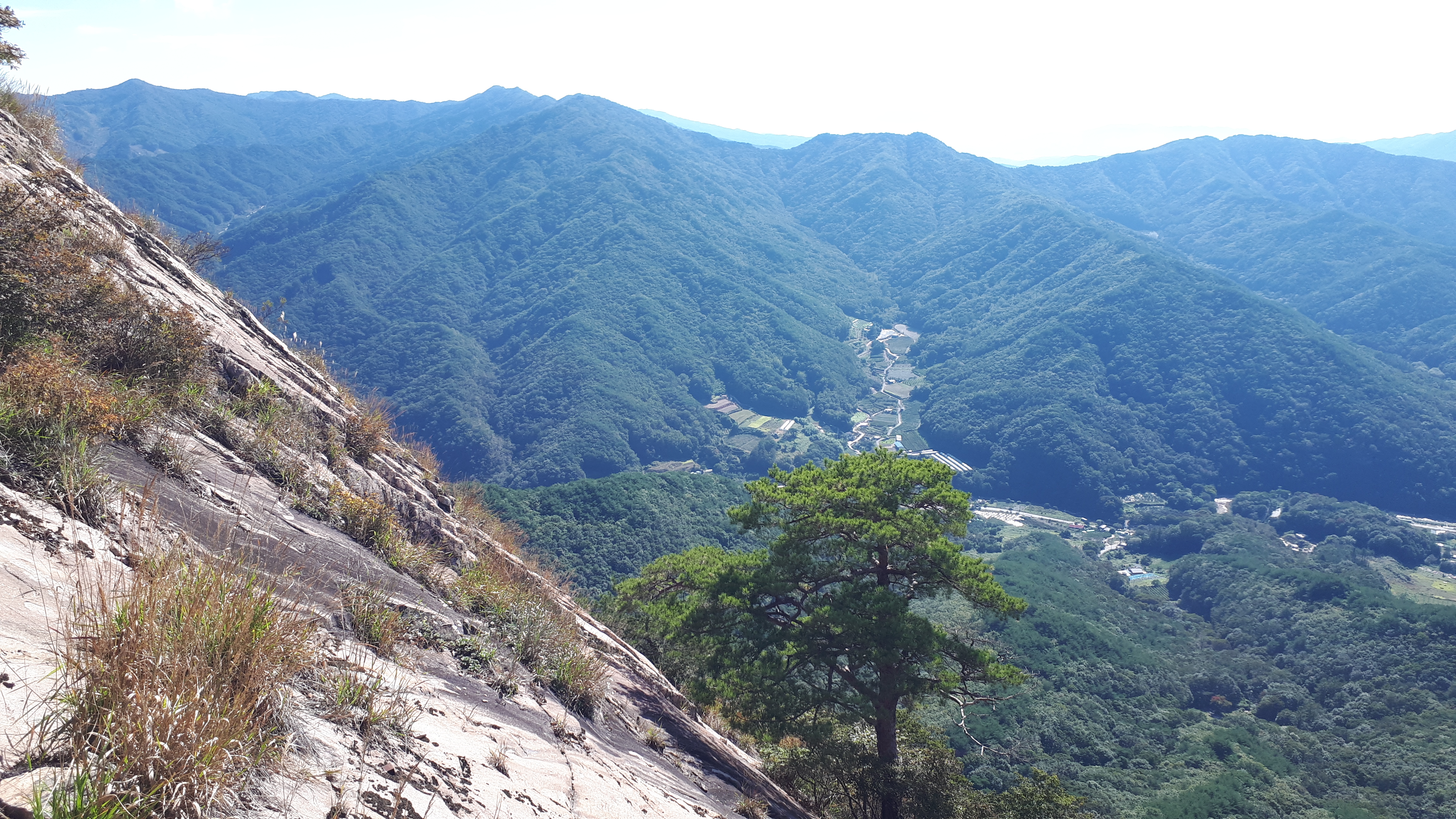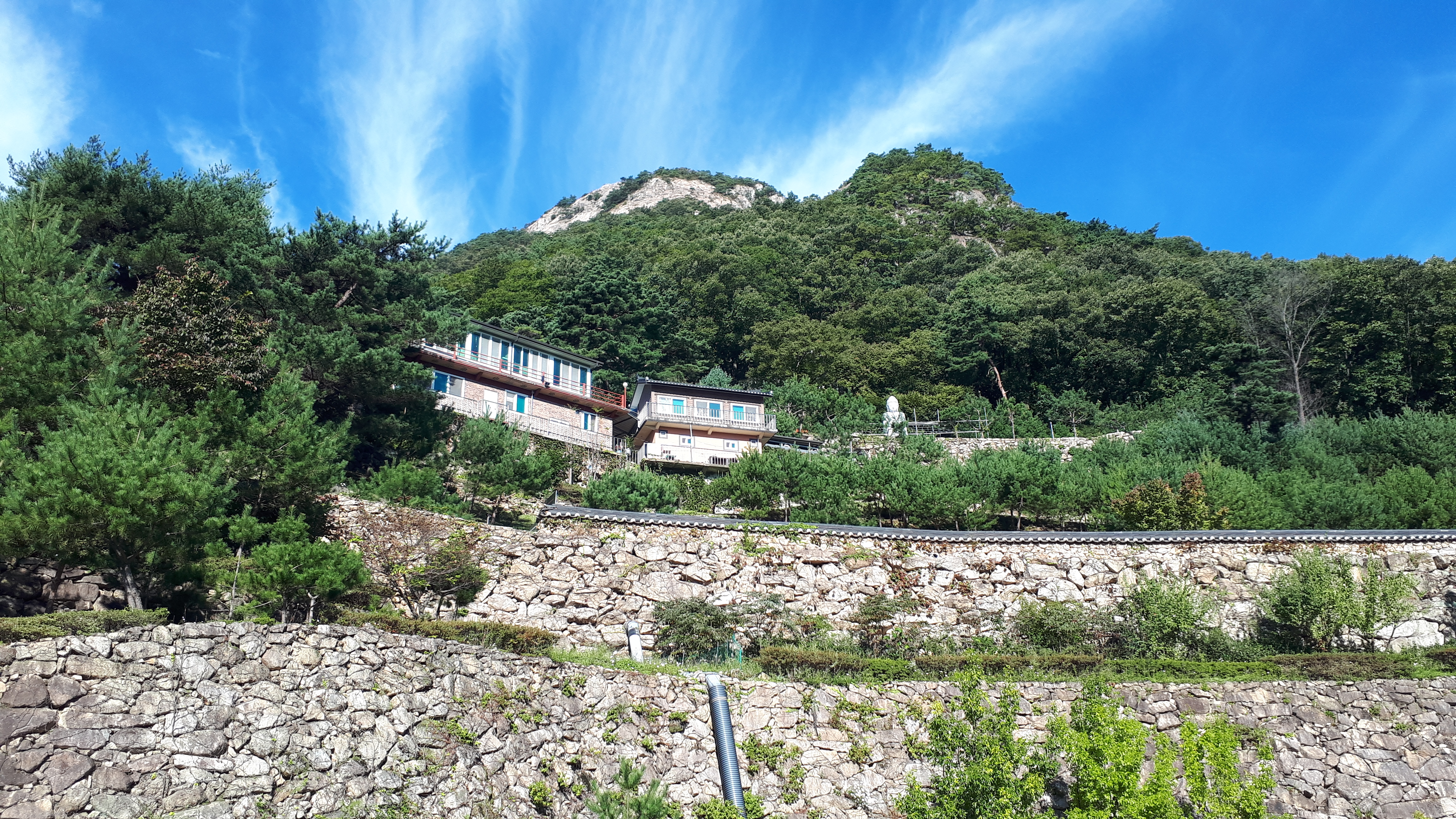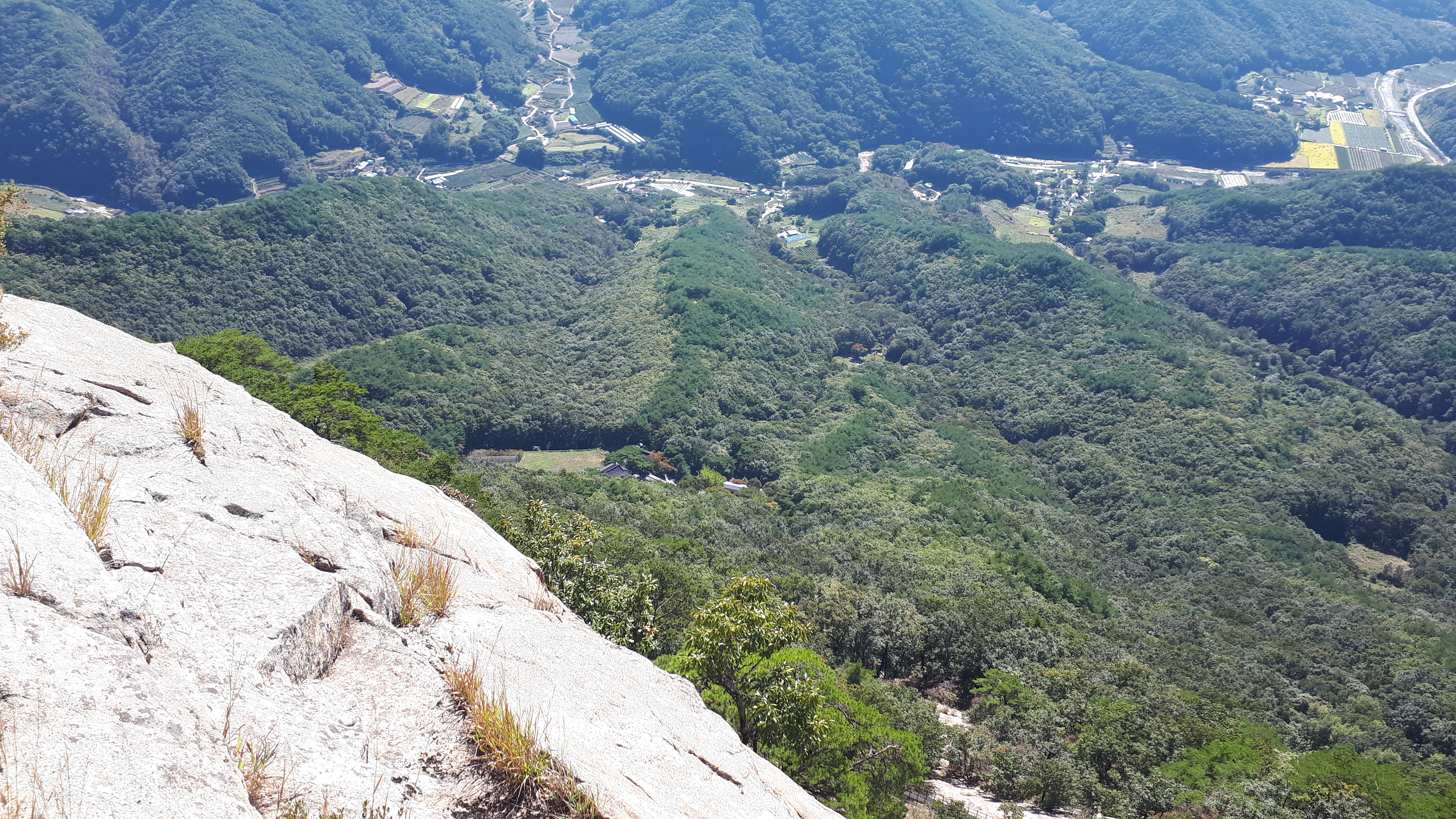거대한 문경 천주산(836m) 바위슬랩 아래로 천주사를 바라보며 천주사로 왔던길을 되짚어 내려갑니다.