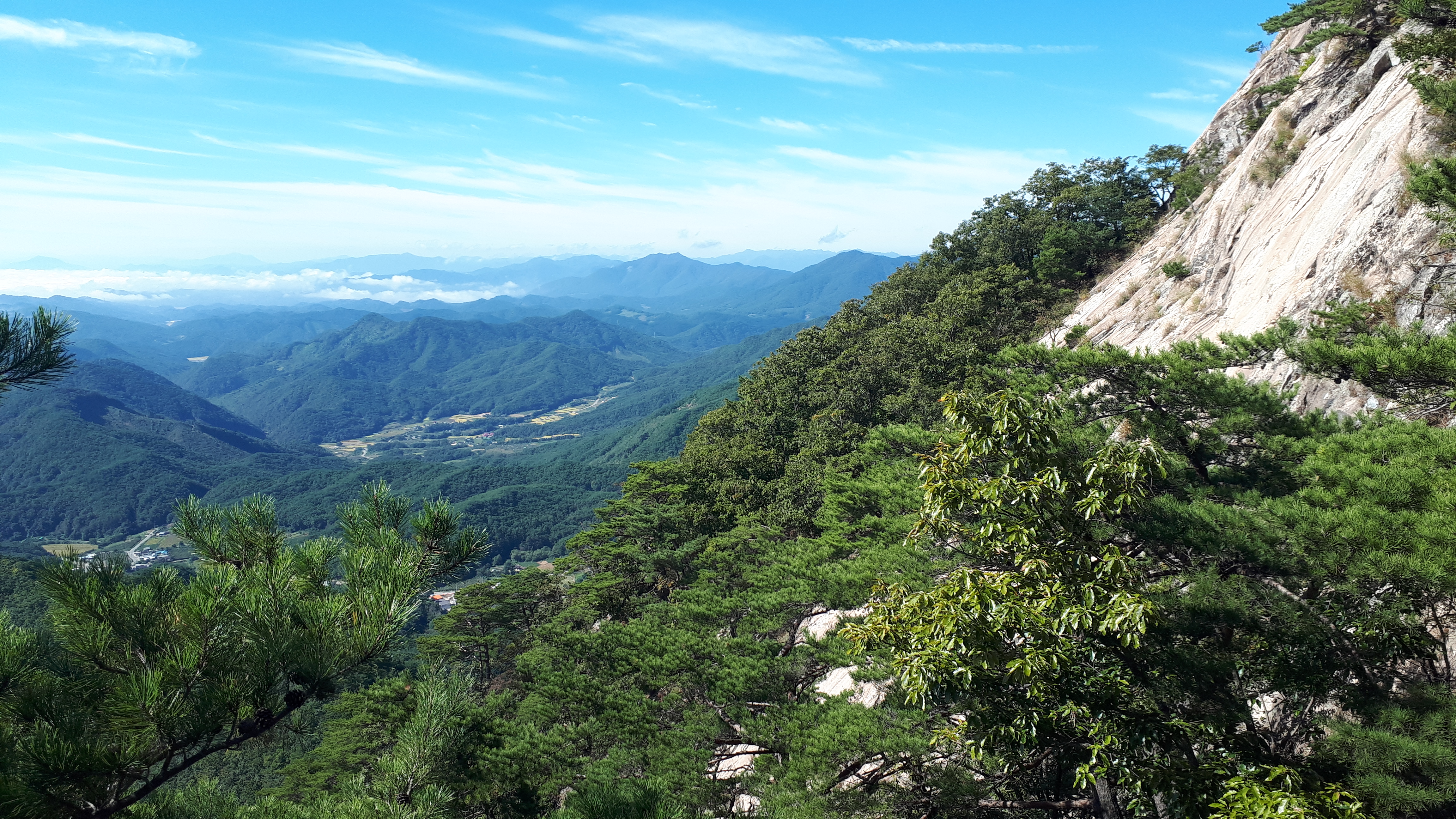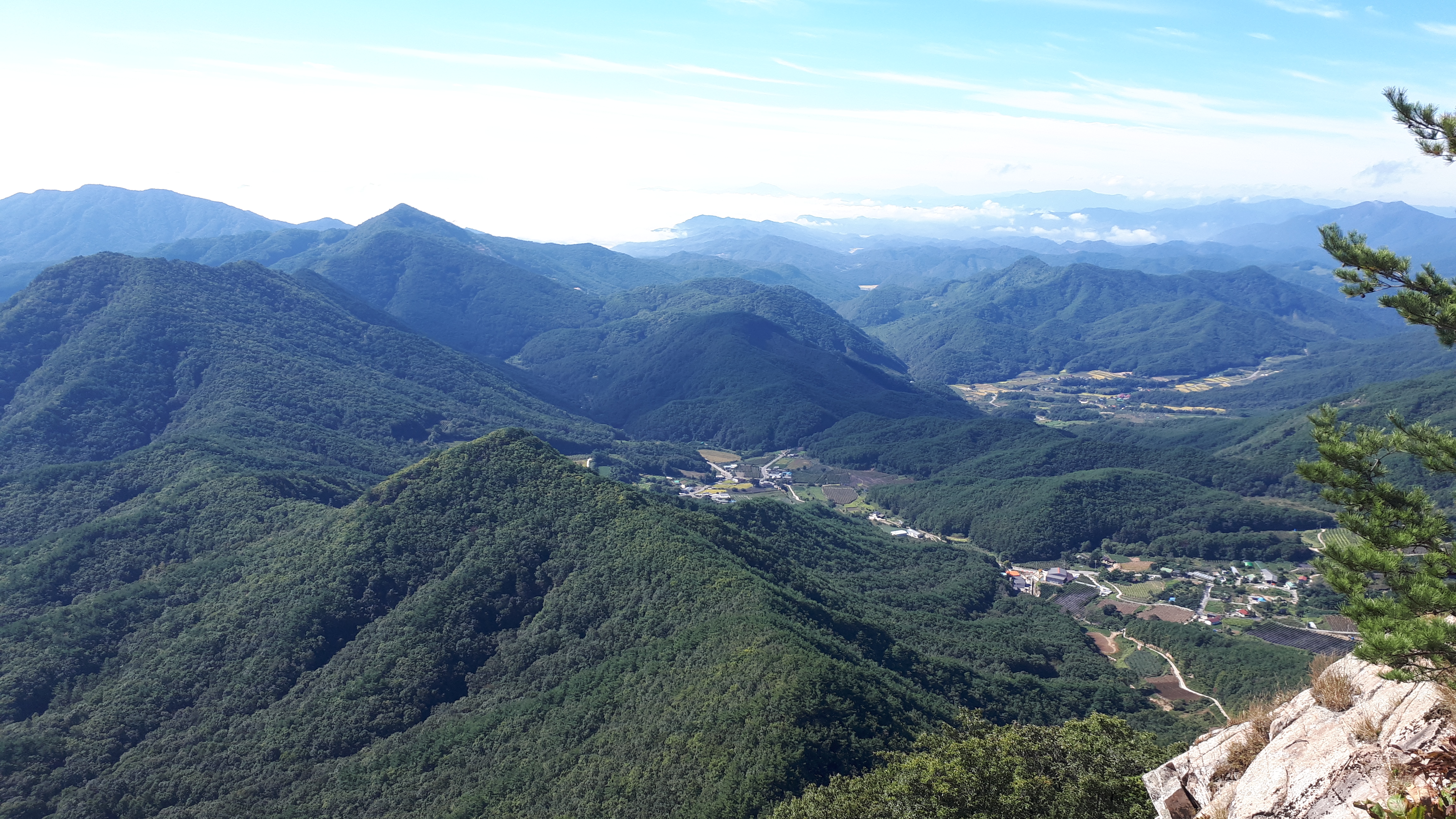 문경 천주산(836m) 정상에서 경북 문경시 산북면 수평리 쪽을 바라보면, 저 멀리 펼쳐지는 하얀 운해가 그림입니다.