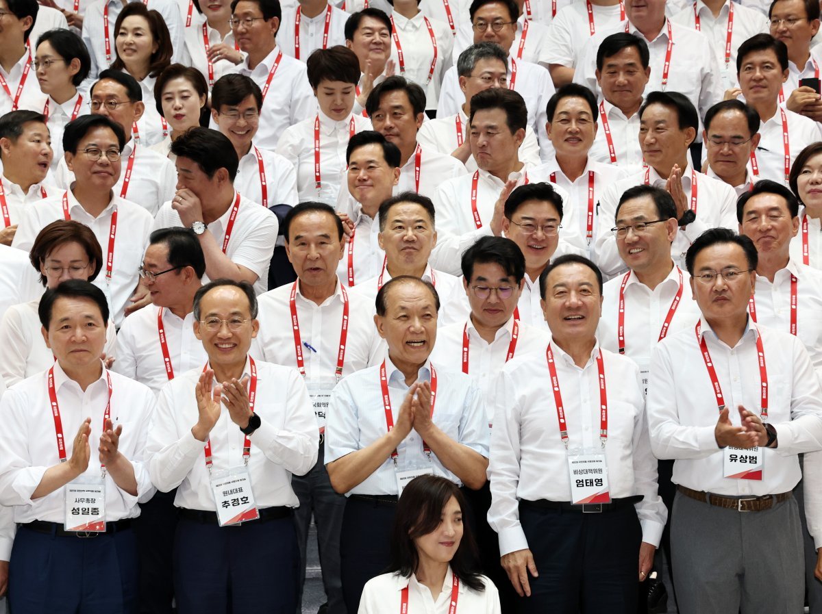 국민의힘 황우여 비상대책위원장과 추경호 원내대표 등 의원들이 30일 오후 충남 천안 재능교육연수원에서 열린 국민의힘 제22대 국회의원 워크숍에서 기념촬영을 마친 뒤 손뼉을 치고 있다. 2024.5.30