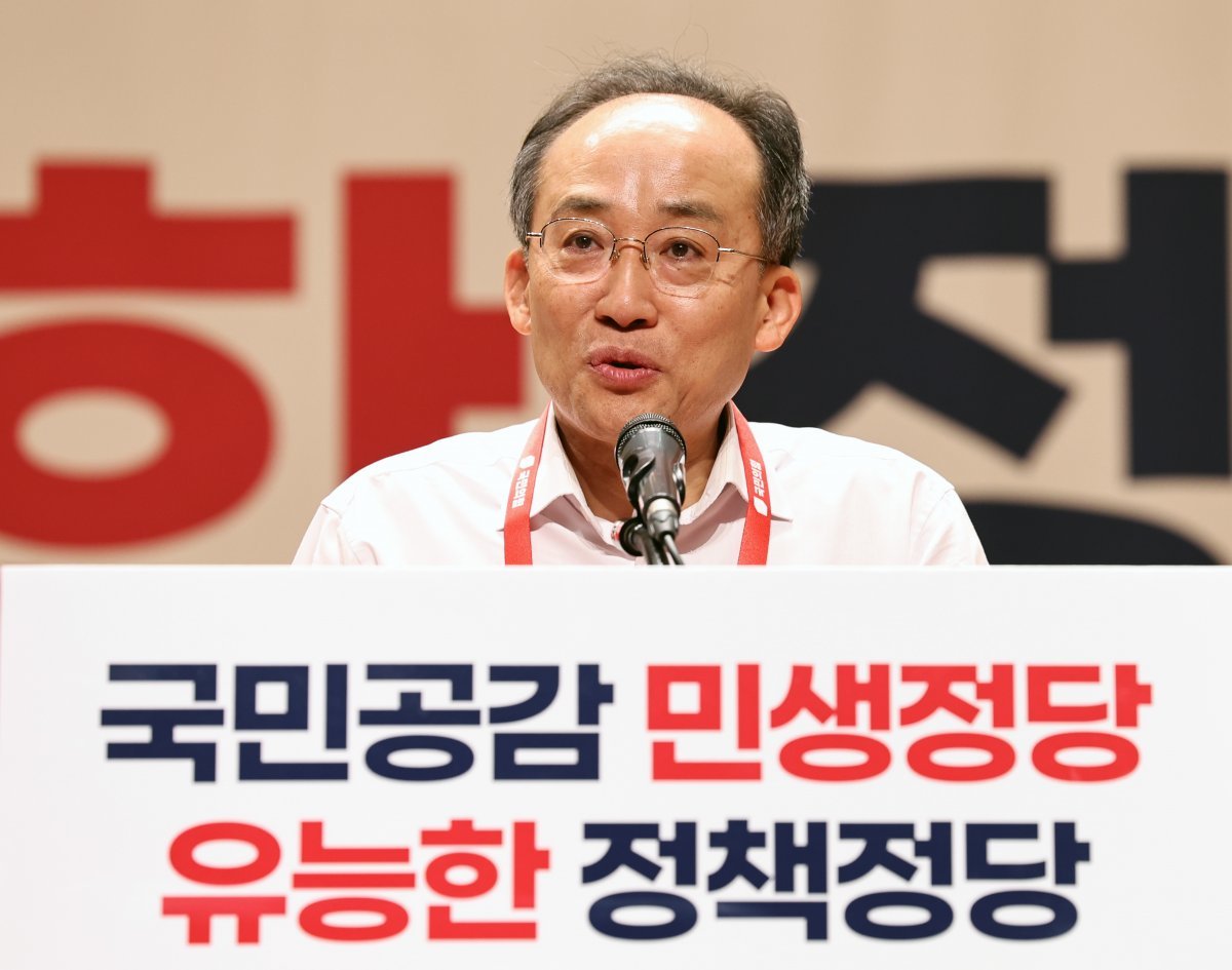 추경호 국민의힘 원내대표가 31일 오전 충남 천안시 재능교육연수원에서 열린 제22대 국회의원 워크숍에서 마무리 발언을 하고 있다. 2024.5.31