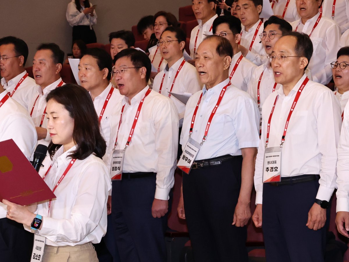 국민의힘 황우여 비상대책위원장과 추경호 원내대표 등 의원들이 31일 오전 충남 천안시 재능교육연수원에서 열린 제22대 국회의원 워크숍에서 결의문을 낭독하고 있다. 2024.5.31