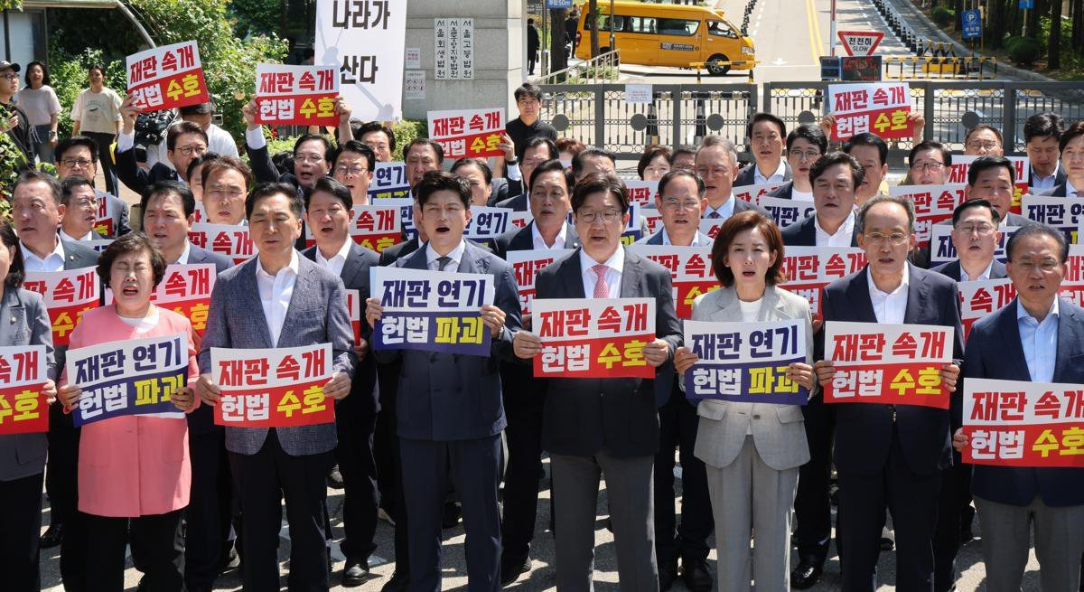 김용태 국민의힘 비상대책위원장과 권성동 원내대표 등 참석 의원들이 11일 오전 서울 서초구 서울고등법원에서 법원의 이재명 대통령 공직선거법 위반 파기환송심 기일 추후 지정 결정을 비판하는 현장의원총회를 열고 구호를 외치고 있다.