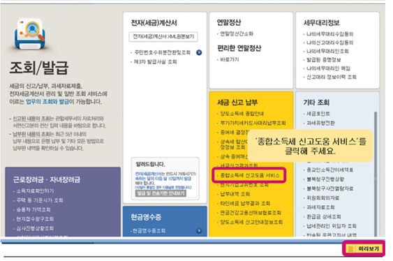 다음 인증절차(공인인증서 및 휴대폰인증)후 문서확인하면 신고안내문(수입금액등)을 열어보실수 있습니다.