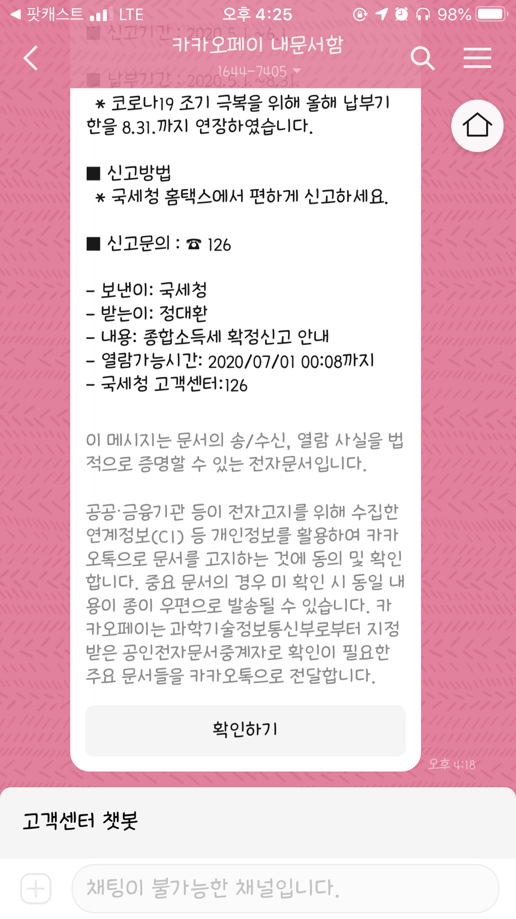 국세청으로부터 종합소득세 관련 카톡을 받았다면 하단에 내용확인을 눌러주세요