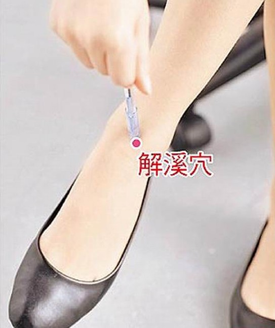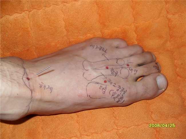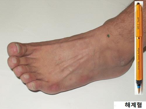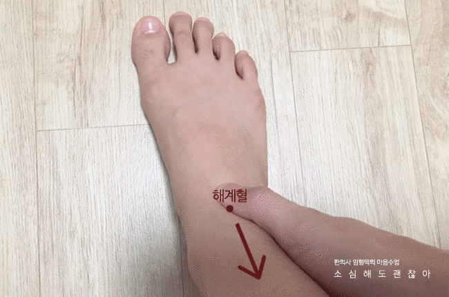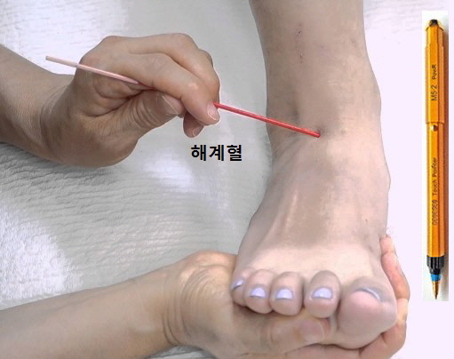 발목을 구부렸을때 앞 발목부위에서 두개의 힘줄이 두드러지게 드러나는데 그 중간 오목한곳이 해계혈입니다