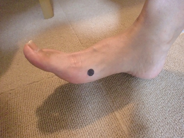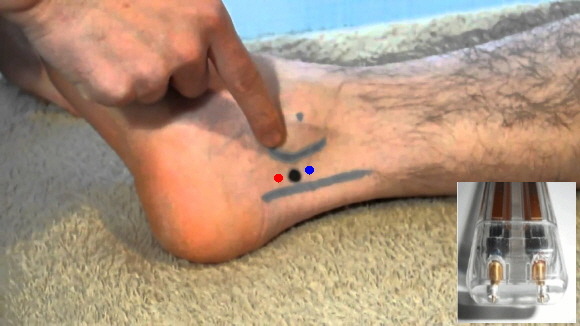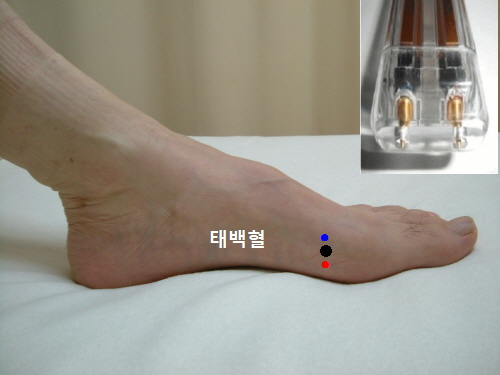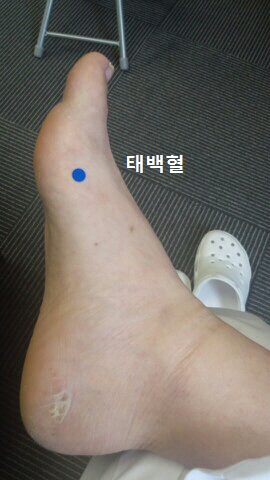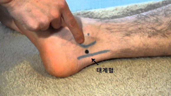 태계혈의 위치는 안쪽 복사뼈 중심에서 아킬레스건 사이의 중간지점에 있습니다