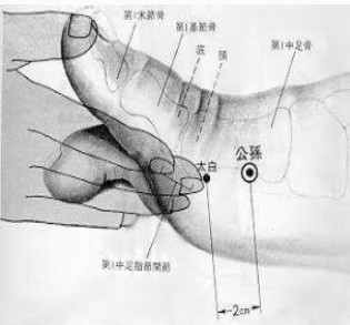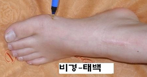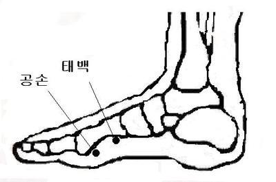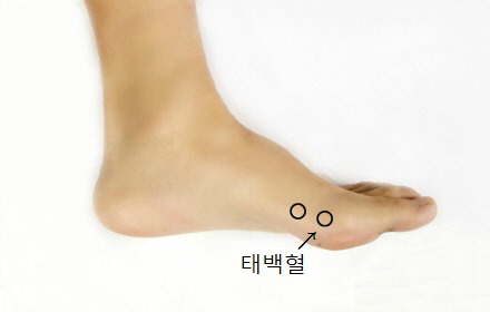 엄지발가락 안쪽 도드라진 뼈 아래의 오목한 곳에 있다. 특히 적백육제를 잘 확인해야 한다.