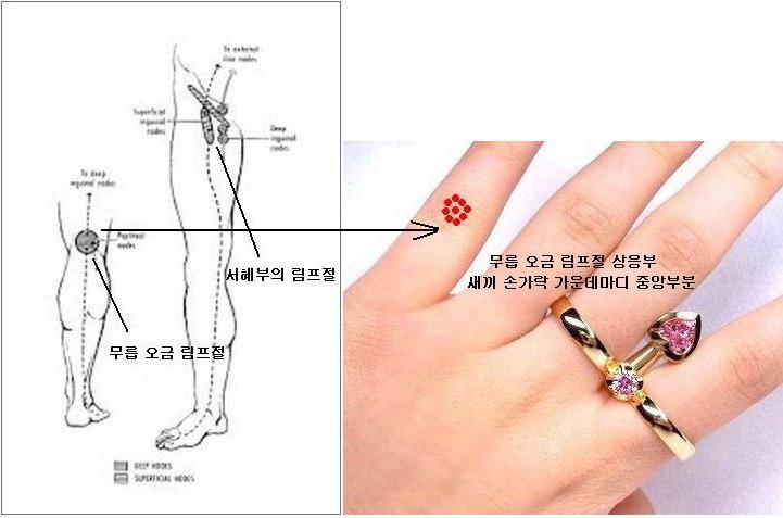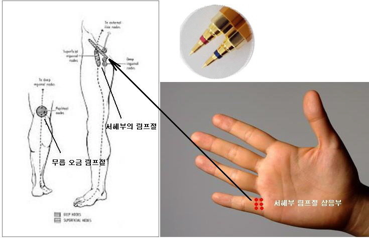 오금다리 임파절 상응부위 자리에 제니센을 추가로 터치하게끔 자리를 알려주고 스스로 치료함
