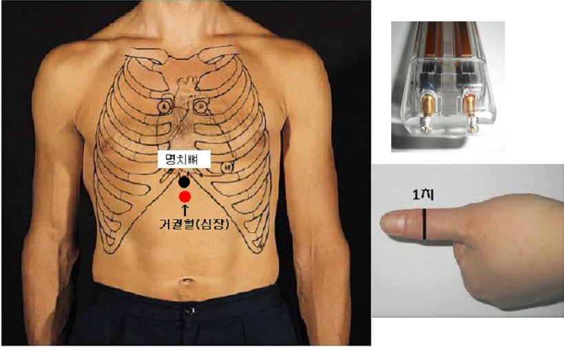 거궐혈은 명치뼈끝에서 1치 바로 아래 지점입니다