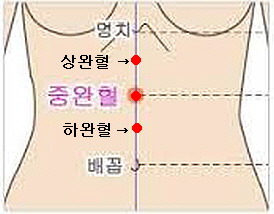 중완혈과 명치사이 1/2 지점 (중간지점)이 상완혈에 해당하며