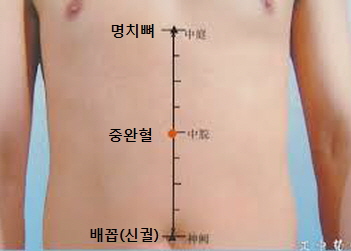중완혈은 반듯하게 누운 상태에서 명치뼈와 배꼽 사이 정중간 지점이 중완혈입니다