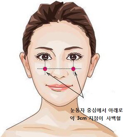 눈동자를 중심으로 3cm정도 아래로 내려간곳이 사백혈입니다.