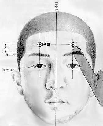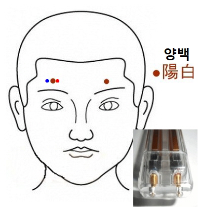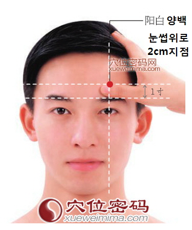 눈썹 정중앙에서 위쪽으로 약 2cm지점이 양백혈 입니다