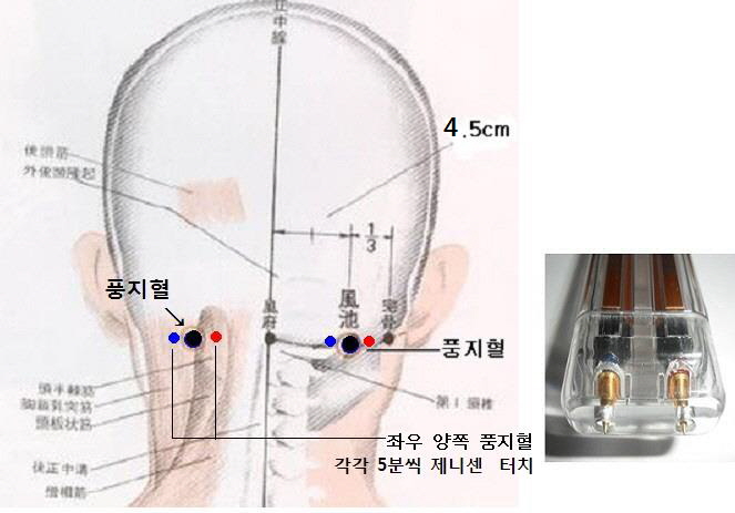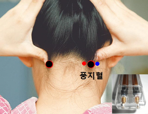 제니센을 휴대용기에 넣고 좌우 양쪽 풍지혈 두곳을 차례로 2~3분 터치 합니다