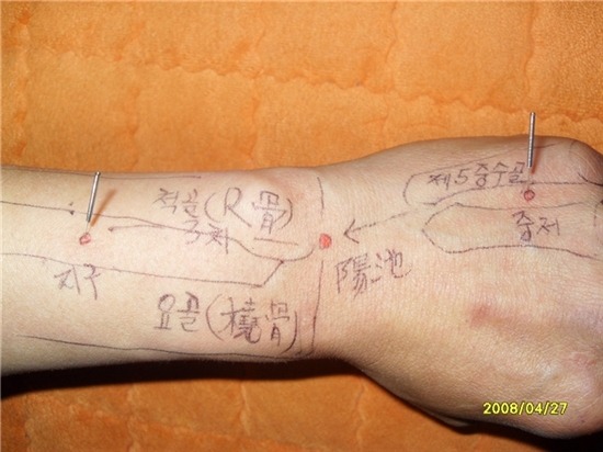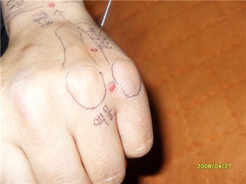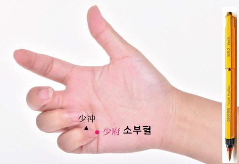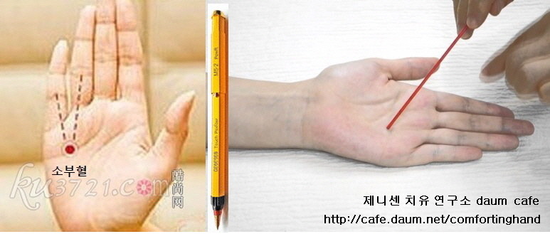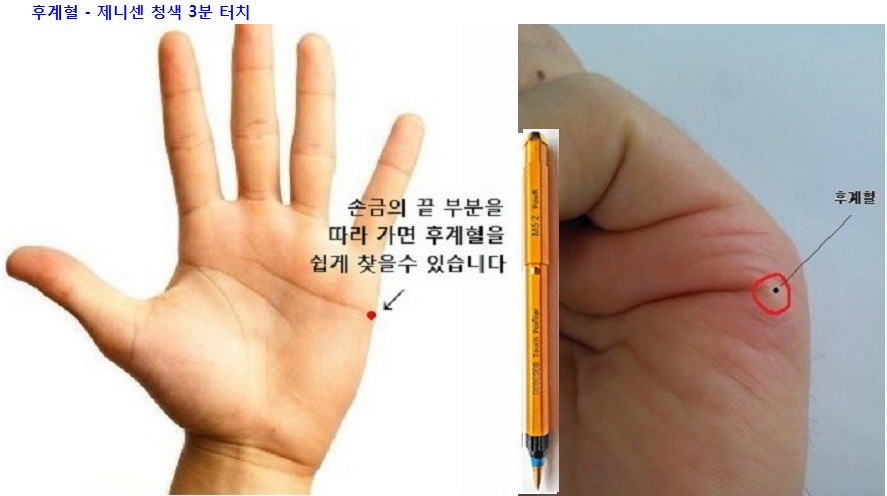 오른손 소부혈에 제니센 적색 3분 정도 터치 오른손 후계혈에 제니센 청색 3분 정도 터치 합니다