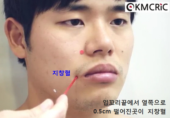 입꼬리에서 좌우 양옆으로 0.5cm지점이 지창혈 입니다