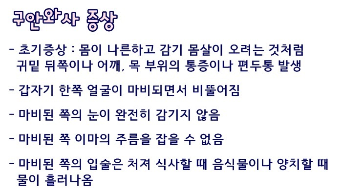 작년겨울 감기후유증으로 얼굴 오른쪽에 구완와사가 발생 한의원에서 침 치료후 증상이 나아졌으나