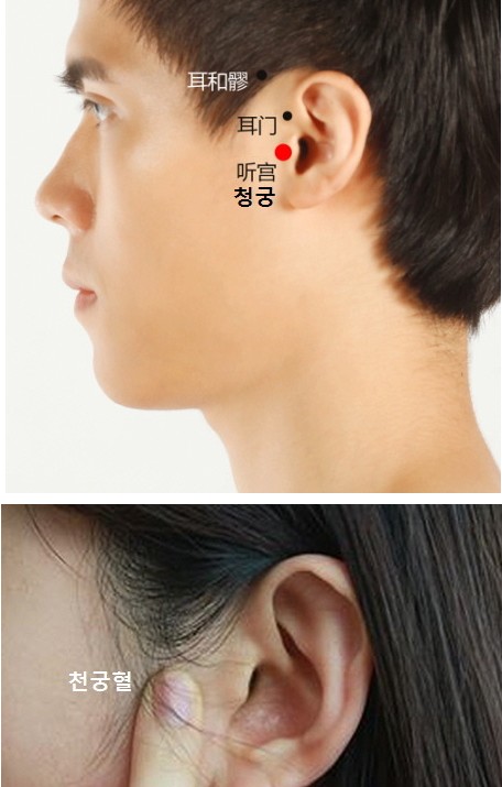 청궁혈은 귀바로 앞쪽 한가운데 앞쪽 움푹 패인 곳이 청궁혈입니다