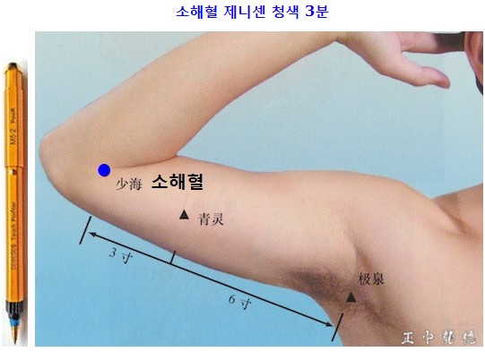 팔꿈치 안쪽에서 안쪽 주름이 끝나는 부분인 소해혈에 제니센 청색으로 3~5분정도터치 해 줍니다