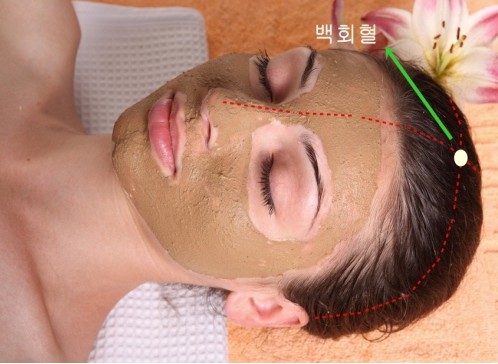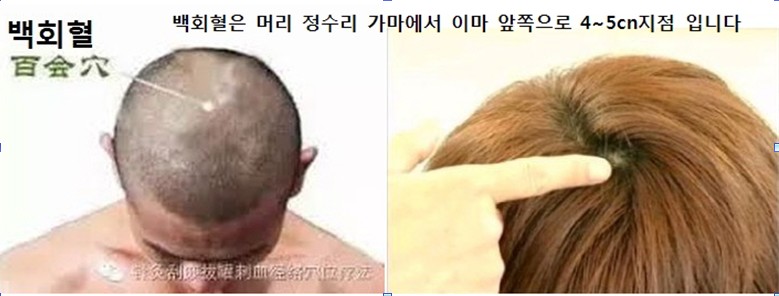 머리 위로 선을 그을경우 정수리 중앙에서 만나는 지점이 "백회혈"입니다