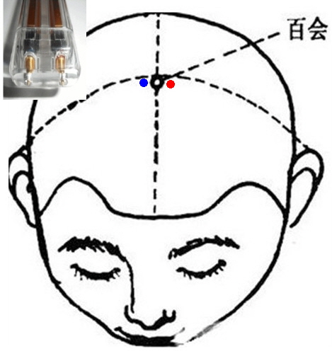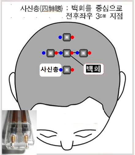 각각 3센치 지점과 백회혈 왼편쪽 오른편쪽 각각 3센티 지점