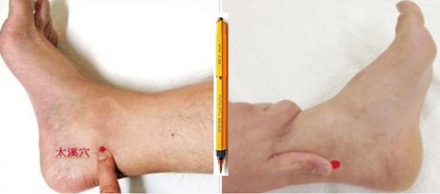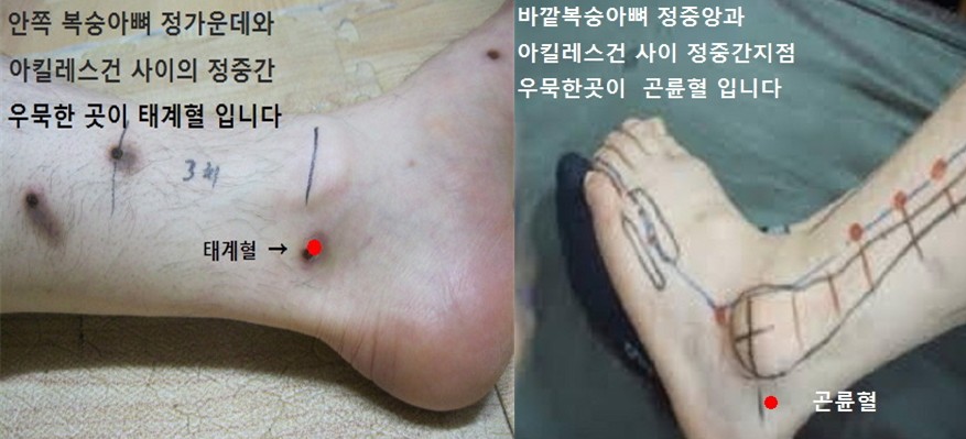 복숭아뼈 중앙지점과 아킬레스건 사이 중간지점이 태계혈이고