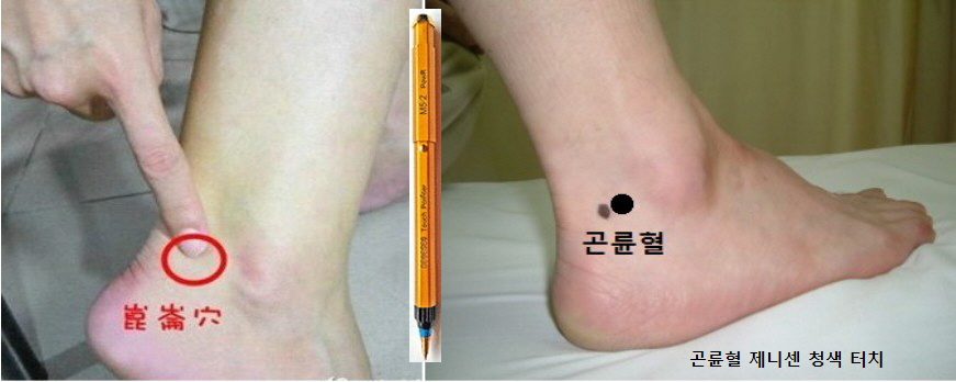 동시에 오른쪽발에서 곤륜혈에 제니센 청색으로 대어 주어서