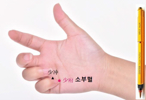 주먹을 살짝 쥐었을때 새끼손가락 끝부분이 손다닥 손금에 닫는지점이 소부혈 입니다