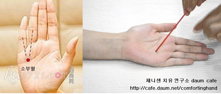 이러한 극렬한 두통은 손바닥의 소부혈에 제니센 적색으로 3~5분 터치 한 후