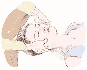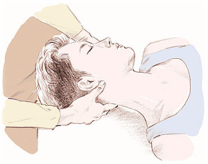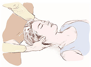 목 밑으로 손을 넣어 턱 중앙에서 귀 사이의 움푹 들어간 부분(협차)을 5분정도 터치 해 줍니다.