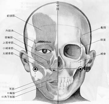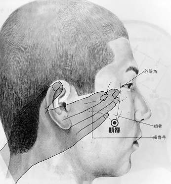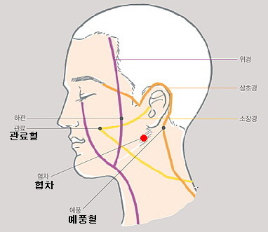 관료혈은 그림에서와 같이 눈초리에서 뺨 아래쪽으로 내려와 광대뼈 바로 아래의 끝지점 우묵한 곳에 있다