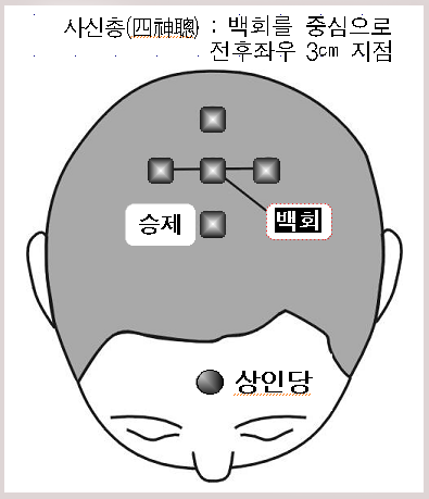 이때 머리 꼭대기 두정부에는 백회(百會)라는 경혈이 있는데 이곳의 전후 좌우 3cm 되는 곳을 합해서 사신총이라 한다.