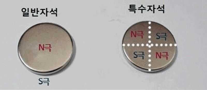 특수자석은 앞 뒷면에 S과 N극이 동시에 4개씩 착자가 되어 있어