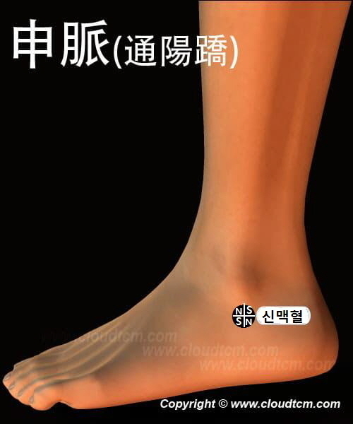 신맥혈은 바깥쪽 복숭아뼈 중심선 바로 아래